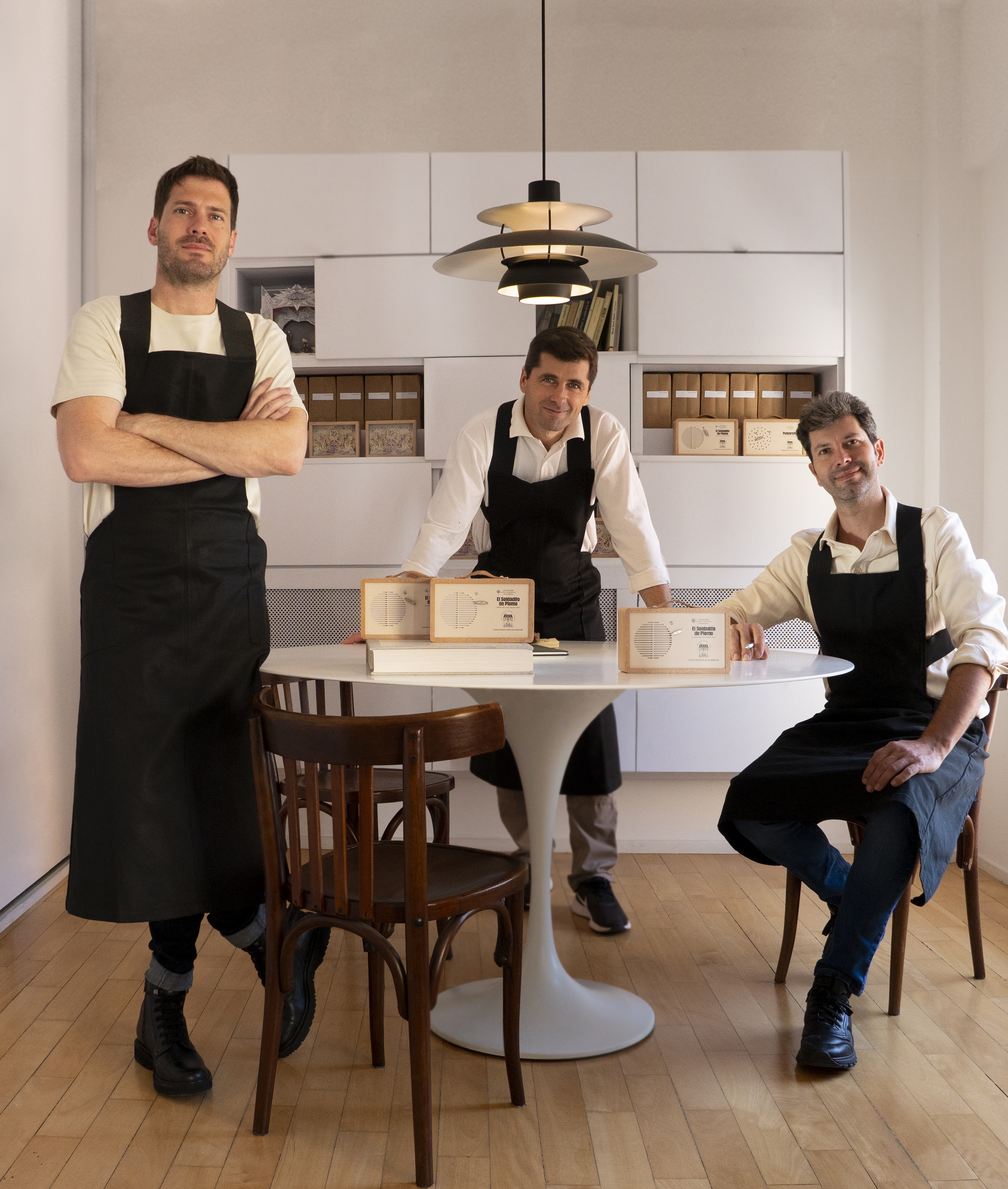 De izquierda a derecha: Germán Bertinat, fundador y director creativo; Juan Manuel Giacomino, carpintería y Walter Gonzolín, ensamblado y relojería.